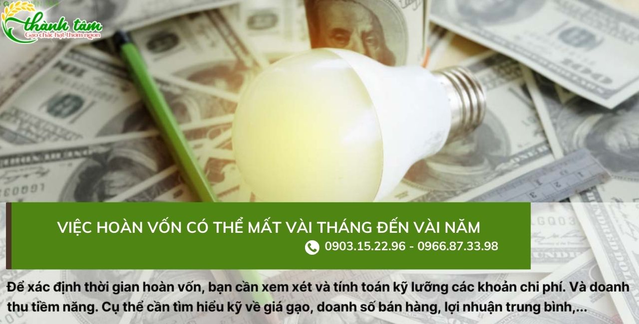 Thời gian để hoàn vốn khi mở cửa hàng bán gạo có thể thay đổi tùy thuộc vào nhiều yếu tố. Như quy mô kinh doanh, vị trí cửa hàng, chiến lược tiếp thị, mức giá gạo, chi phí hoạt động,… Thông thường, việc hoàn vốn có thể mất từ 2 – 4 tháng hoặc vài năm. Để xác định thời gian hoàn vốn, bạn cần xem xét và tính toán kỹ lưỡng các khoản chi phí. Và doanh thu tiềm năng. Cụ thể cần tìm hiểu kỹ về giá gạo, doanh số bán hàng, lợi nhuận trung bình,…Ngoài ra, kế hoạch kinh doanh cụ thể từng thời điểm. Cùng với việc thực hiện và điều chỉnh chiến lược kinh doanh cũng sẽ ảnh hưởng đến thời gian hoàn vốn.