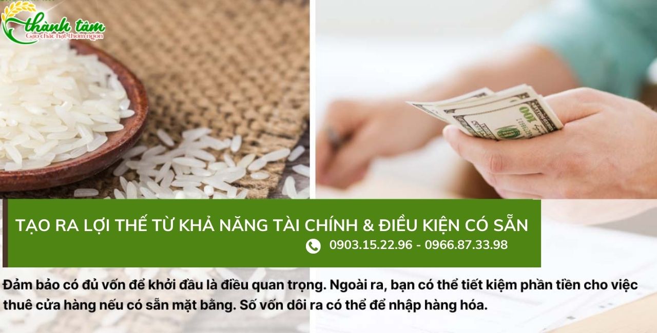 Có mặt bằng muốn làm đại lý gạo và bạn có thể tiết kiệm được khoảng chi phí cố định cho việc thuê cửa hàng. Số vốn dôi ra có thể để nhập hàng hóa. Tương tự, nếu có sẵn sản phẩm, số vốn cần càng thấp.